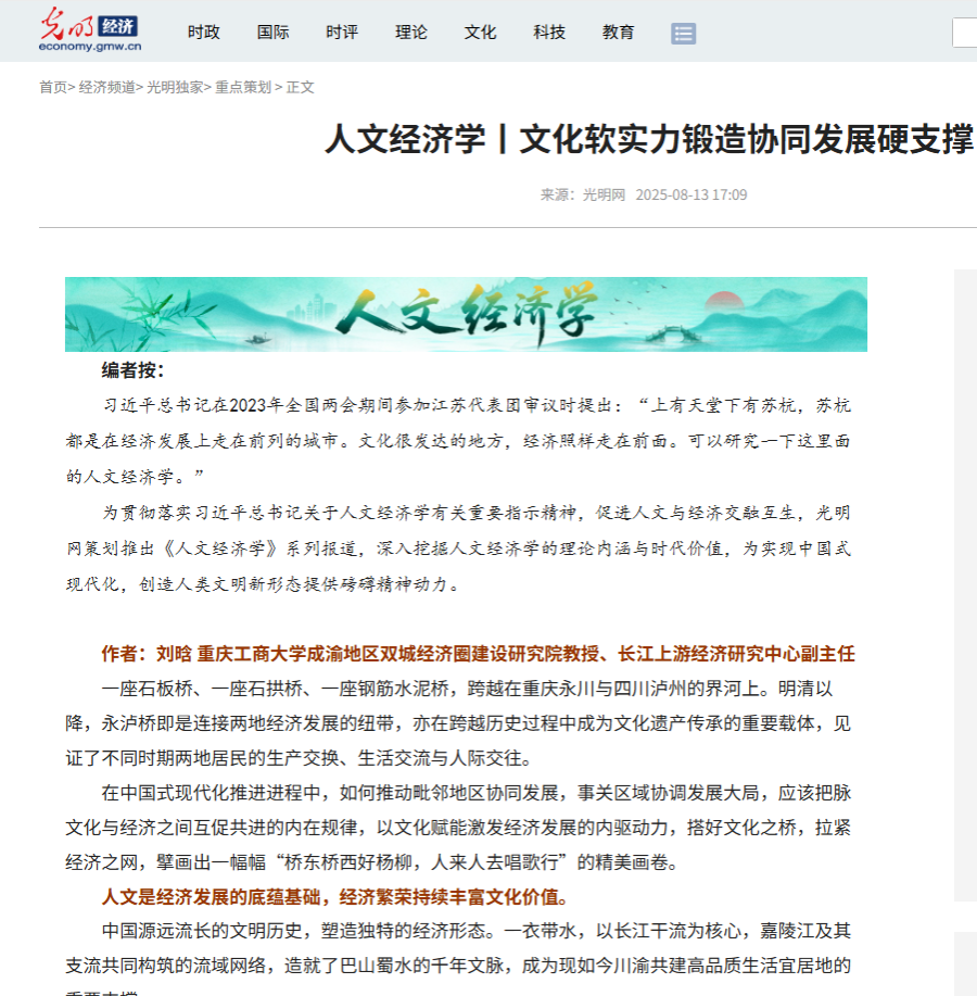 近日,研究院刘晗教授题为《文化软实力锻造协同发展硬支撑》的理论文章,被光明网《人文经济学》系列报道。