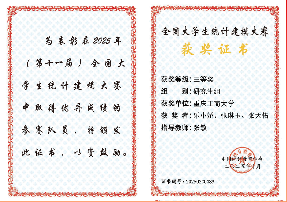 近日,第十一届全国大学生统计建模大赛结果揭晓。由研究院专职研究员张敏副教授担任指导老师、2023级数量经济学专业硕士研究生乐小娇等组成的团队,其参赛作品《数字经济行业效率影响因素与路径提升研究——基于新质生产力视角的随机森林算法实证分析》表现优异,荣获全国三等奖。