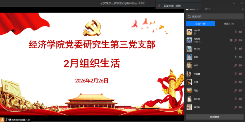 为深入学习贯彻中央城市工作会议精神,准确把握新时代发展的规律与方向,经济学院党委研究生第三党支部于2026年2月26日通过企业微信开展以“深悟城市发展方略,勇担青春发展使命”为主题的组织生活,会议由支部书记刘晗主持。