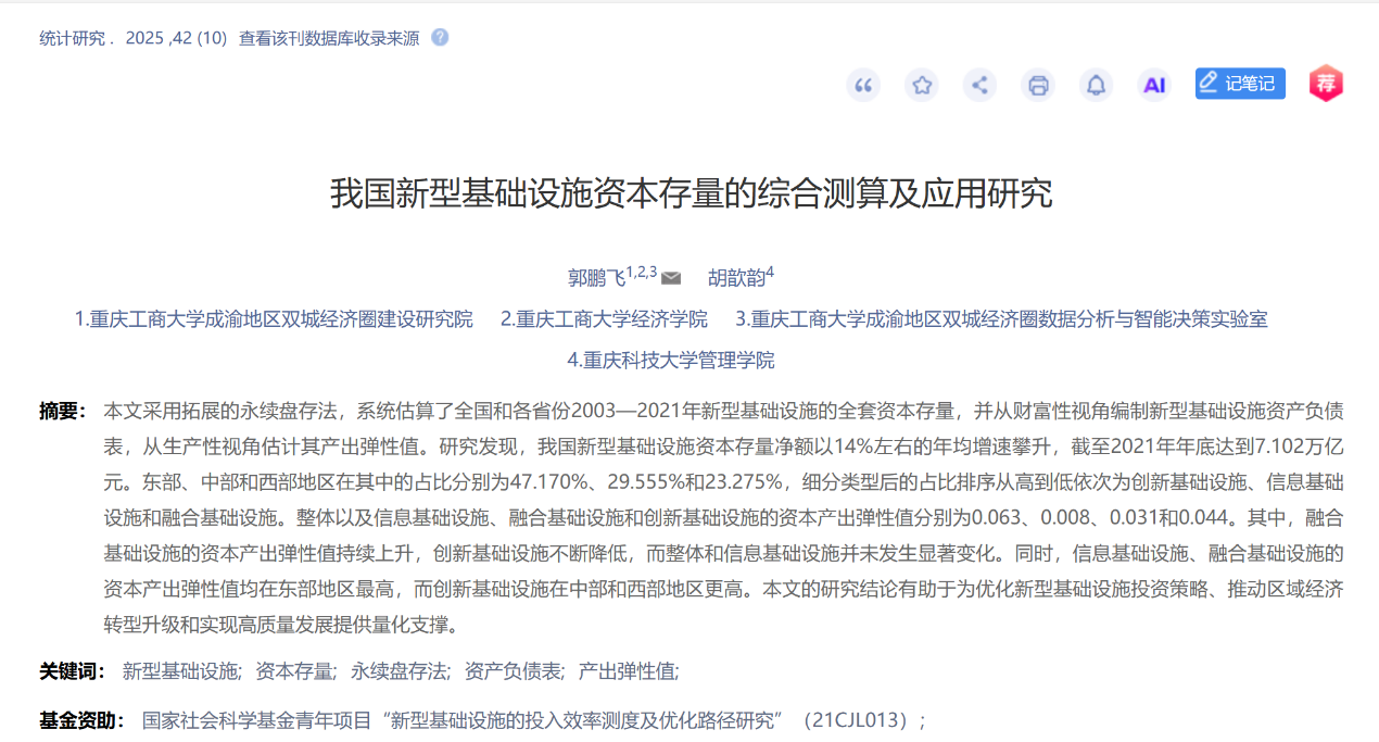 2025年10月,成渝地区双城经济圈建设研究院郭鹏飞副教授等在重要学术期刊《统计研究》上发表题为《我国新型基础设施资本存量的综合测算及应用研究》的论文。