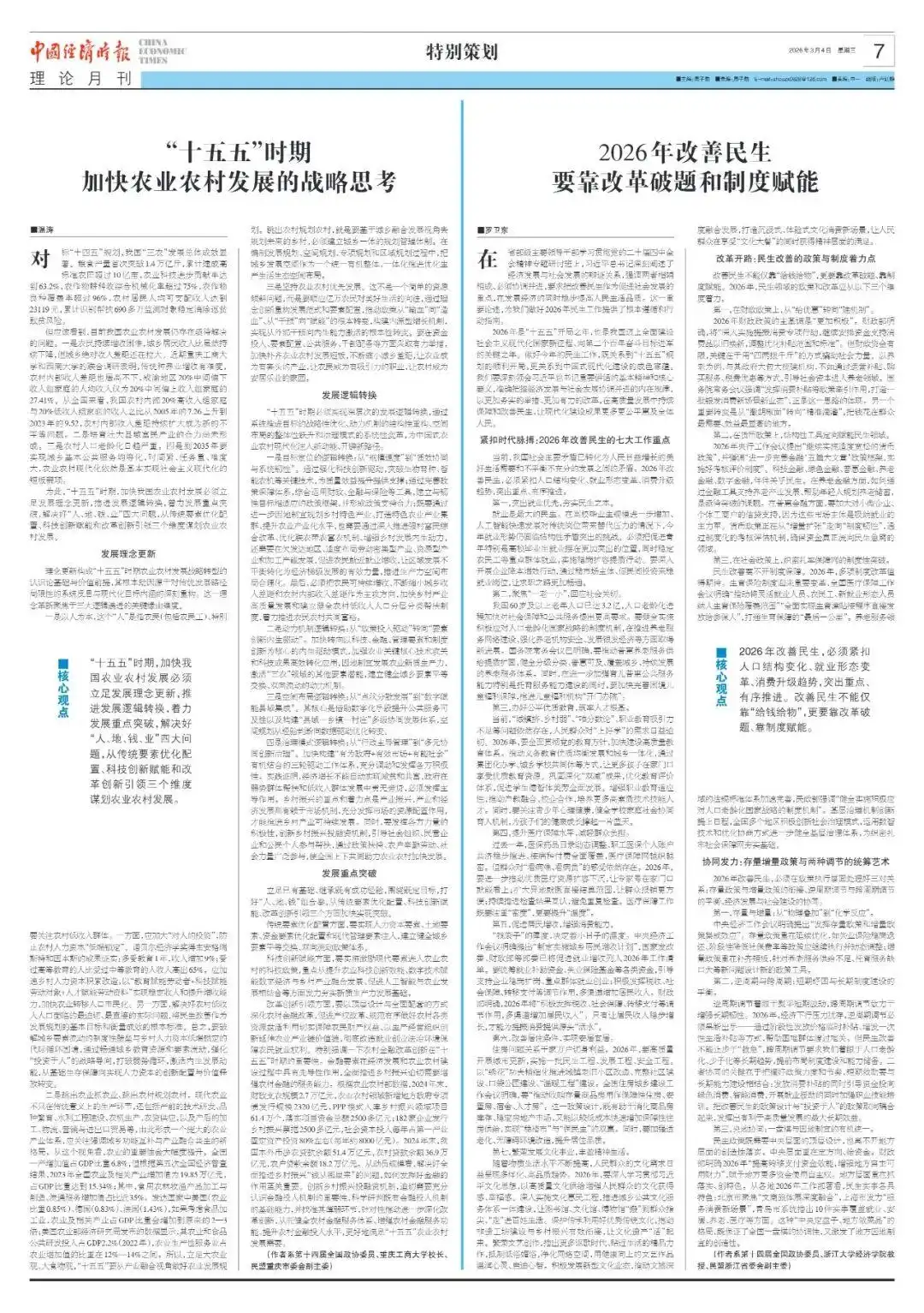 编者按 五年看头年,起步是关键。作为“十五五”开局之年,2026年全国两会备受瞩目,不仅是观察中国宏观政策的重要窗口,也将为未来五年的发展蓝图奠定基础。时值全国两会召开之际,中国经济时报约请高校及智库机构代表委员撰写理论文章,聚焦科技突破、内需攻坚、“三农”发展、财税改革、宏观政策、银发经济等两会核心热点议题建言献策。